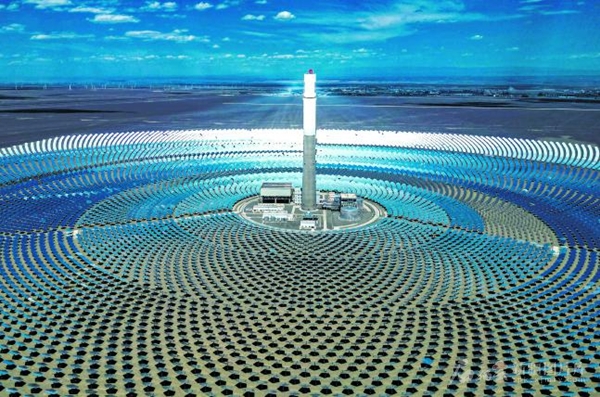 位于伊吾县的中国能建哈密熔盐塔式5万千瓦光热发电站外景(7月8日摄)。该电站设计年均发电量约2亿千瓦时,可满足6.19万户家庭全年用电需求,每年可减少二氧化碳排放15.48万吨。 □石榴云/新疆日报记者蔡增乐摄