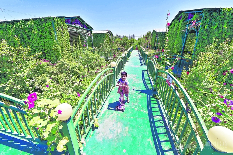 孩子在库尔勒市哈拉玉宫镇中多尕村农家乐玩耍(7月8日摄)。该村通过种植防护林、打造百米鲜花巷道让村庄处处有绿、步步有景,并探索“特色农业+乡村旅游”路径,将美丽环境转化为“美丽经济”。□石榴云/新疆日报记者 王立华摄