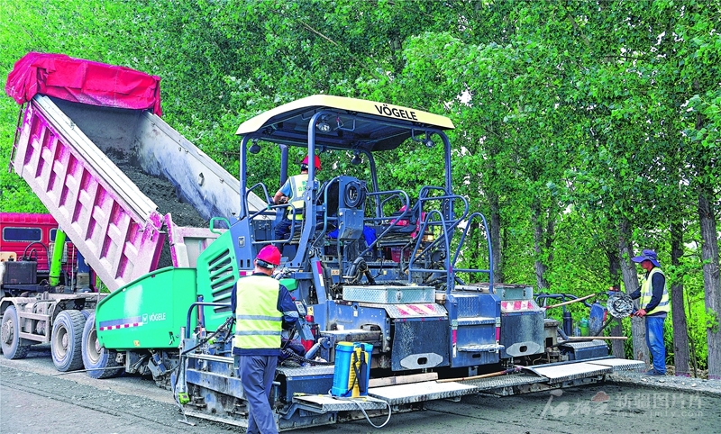施工人员在沙湾市沙温公路改建项目现场作业(7月17日摄)。该项目全长45.5公里,建成后将极大改善群众出行和运输条件,促进当地旅游业发展。□范春海摄