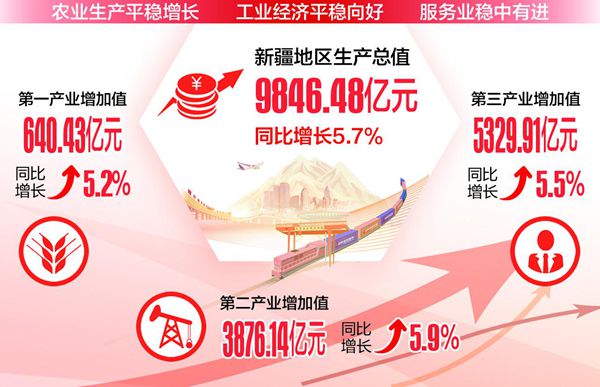 本报乌鲁木齐7月24日讯 石榴云/新疆日报记者高峰报道:根据地区生产总值统一核算结果,上半年,新疆地区生产总值9846.48亿元,按不变价格计算,同比增长5.7%。这是记者从自治区人民政府新闻办公室24日举行的上半年自治区国民经济运行情况新闻发布会上获悉的。