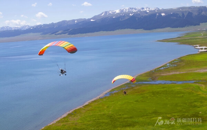 7月29日,游客在赛里木湖景区乘坐动力伞体验低空旅游。□何玉龙摄
