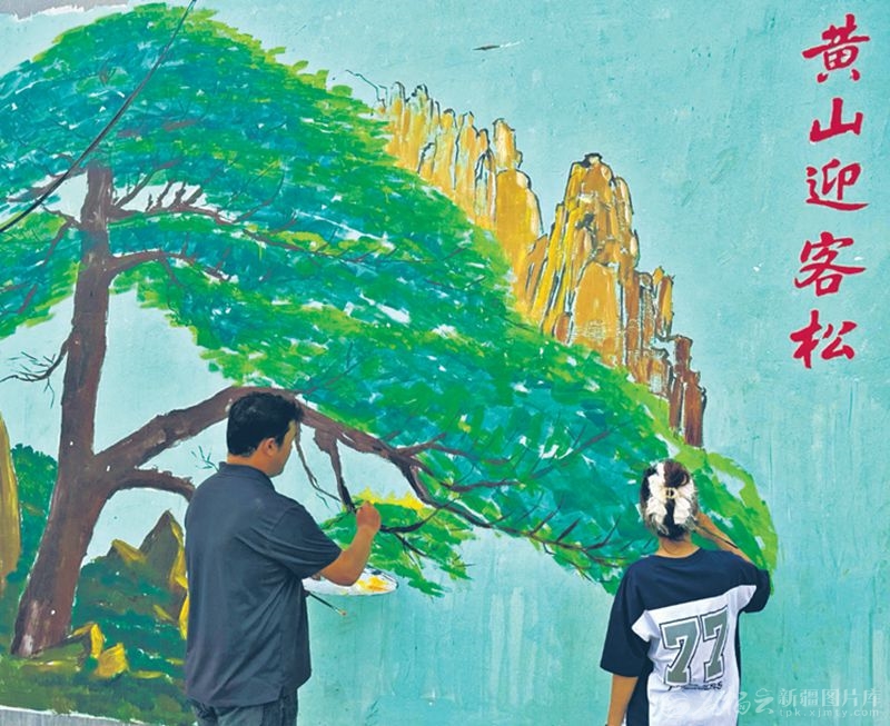8月27日,阿迪力江·阿卜杜木明(左一)带着学生为以黄山迎客松为主题的文化墙补色。