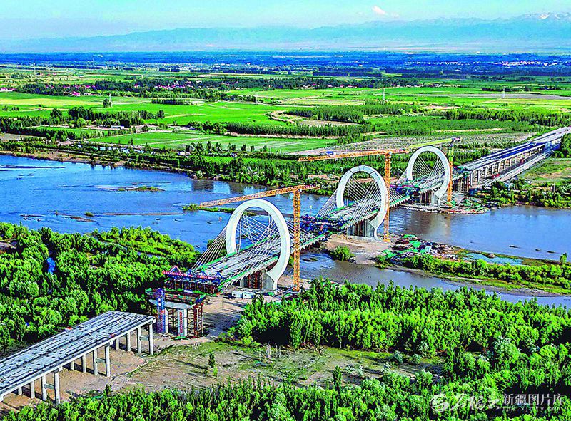 伊犁河三桥建设现场(5月21日无人机摄)。□石榴云/新疆日报记者蔡增乐摄