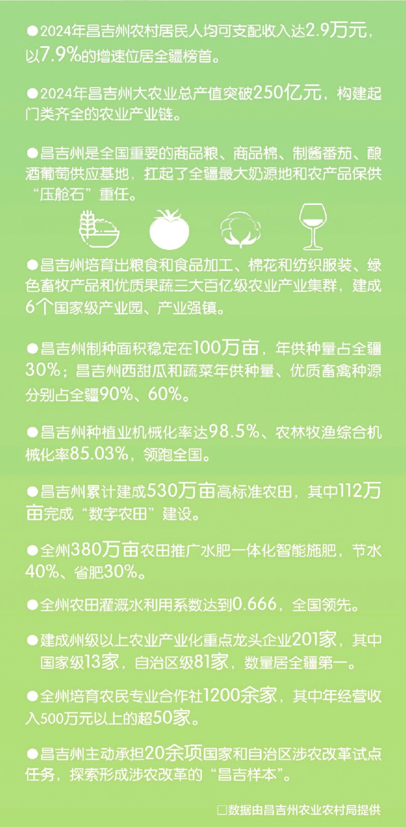 昌吉州锚定“农业更强、农村更美、农民更富”目标,以全链深耕固根基,用科技赋能兴百业,大力推进“三农”工作高质量发展,浓墨重彩描绘出新时代丰收图景--农村居民年人均可支配收入达2.9万元;冬小麦连片种植单产接连刷新全疆百亩、千亩、万亩、十万亩纪录;农产品加工业产值突破600亿元;83个自治区美丽宜居村各展风姿……