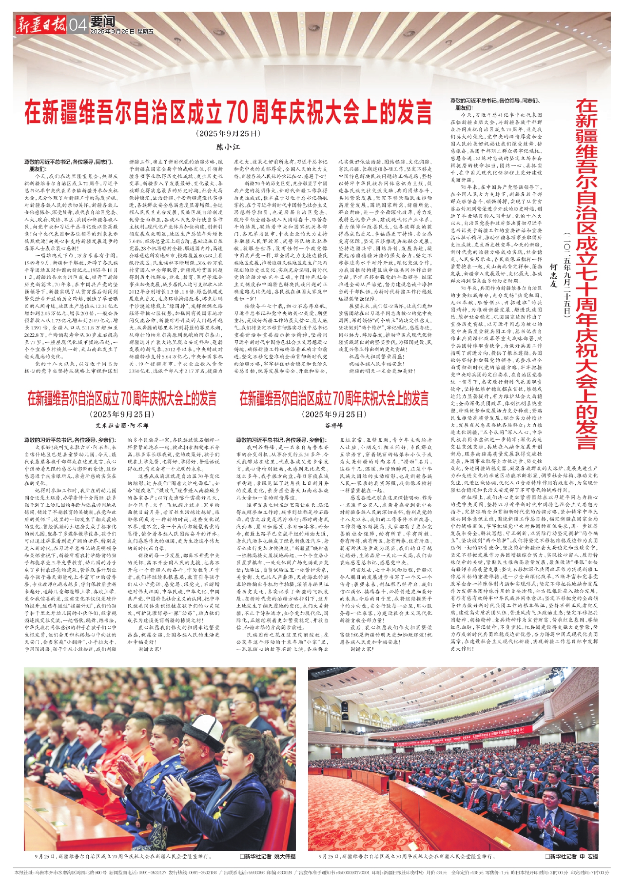 在新疆维吾尔自治区成立70周年庆祝大会上的发言