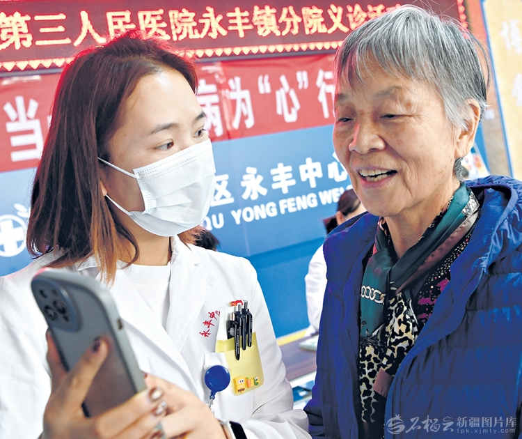 11月19日,自治区第三人民医院永丰镇分院医护人员义诊时为村民介绍网上医保使用流程。当日,位于乌鲁木齐市沙依巴克区永丰镇的该分院正式挂牌,这是我区推动优质医疗资源向基层深度延伸的生动体现。□石榴云/新疆日报记者韩亮摄