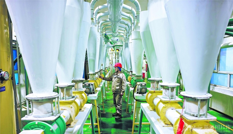 2月2日,中粮八一面业(呼图壁)有限公司员工在生产车间查看设备运行情况。目前,该公司小麦日加工能力达300吨。其30万吨/年加工扩建项目预计今年5月投产,将增强区域粮食安全保障能力。□马光元摄