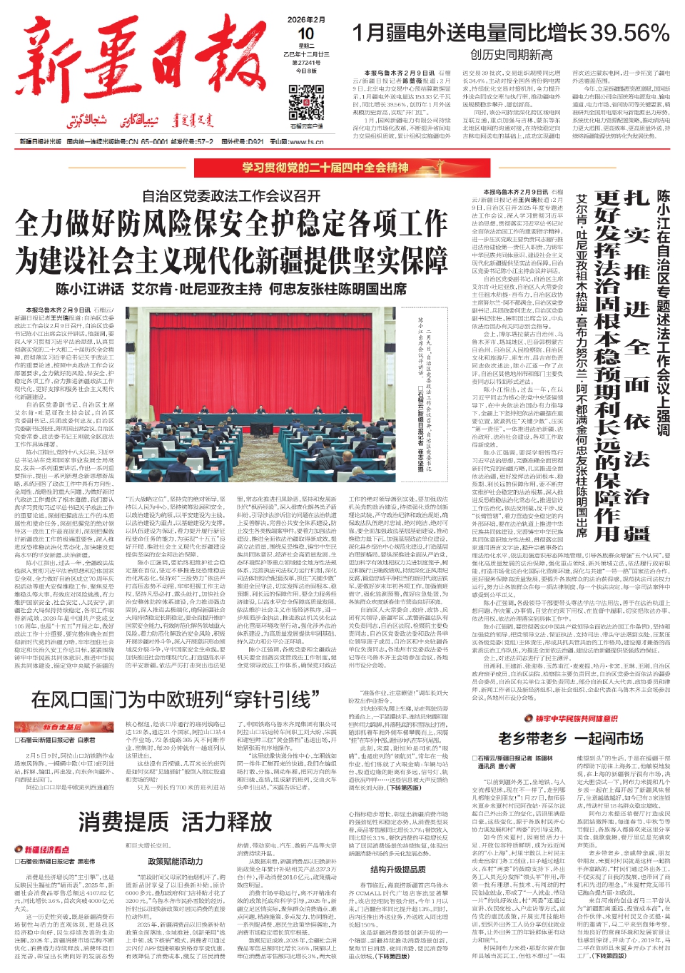 陈小江指出,过去一年,全疆政法战线深入贯彻习近平法治思想和总体国家安全观,全力做好自治区成立70周年庆祝活动等重大安保维稳工作,聚焦反恐维稳头等大事,有效应对风险挑战,有力维护国家安全、社会安定、人民安宁,新疆社会大局保持持续稳定,各项工作取得新成效。2026年是中国共产党成立105周年,也是“十五五”开局之年,做好政法工作十分重要。要完整准确全面贯彻新时代党的治疆方略,牢牢扭住社会稳定和长治久安工作总目标,紧紧围绕铸牢中华民族共同体意识、推进中华民族共同体建设,锚定党中央赋予新疆的“五大战略定位”,坚持党的绝对领导,坚持以人民为中心,坚持统筹发展和安全,以政治建设为统领,以平安建设为主线,以法治建设为重点,以基础建设为支撑,以队伍建设为保证,着力提升履行新征程使命任务的能力,为实现“十五五”良好开局、推进社会主义现代化新疆建设提供坚实的安全和法治保障。