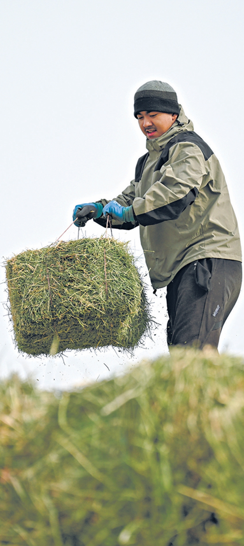 近日,管护员在乔木希拜普氏野马监测站搬运草料。