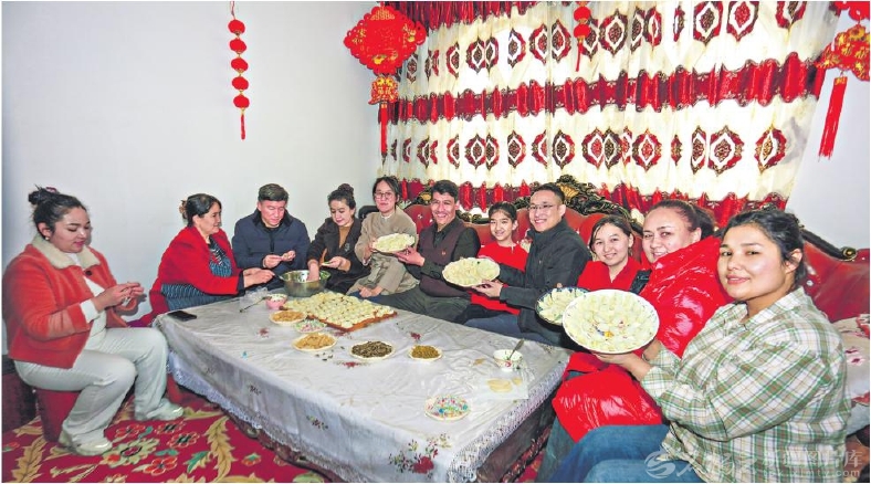 2月16日,和田地区生态环境局洛浦县分局驻洛浦镇多鲁吐格曼贝希村工作队队员与村民一起欢度除夕,其乐融融。□买买提艾力·艾尼瓦尔摄