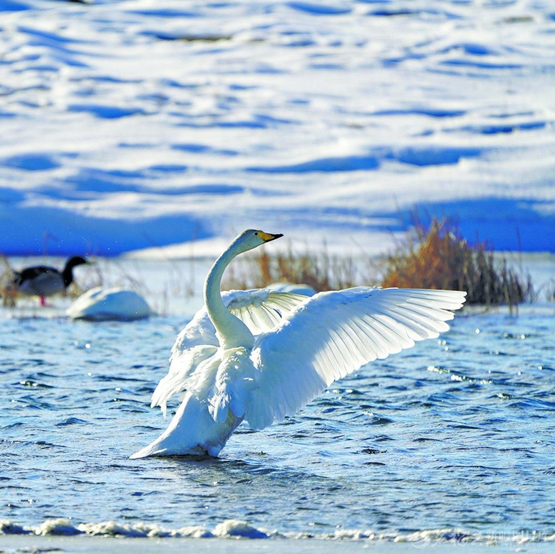 2月22日,大天鹅在巴里坤哈萨克自治县高家湖湿地悠闲戏水。高家湖湿地位于东天山脚下,随着当地加大生态保护和治理力度,这里已成为大天鹅、蓑羽鹤、白鹭等鸟类的繁衍栖息地。□曹新加摄