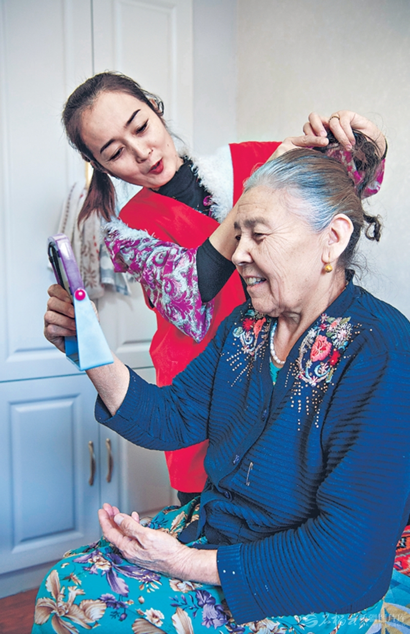 3月4日,在乌鲁木齐市天山区大湾街道延安东路社区孤寡老人家中,志愿者为老人梳理头发。□石榴云/新疆日报记者 约提克尔·尼加提摄