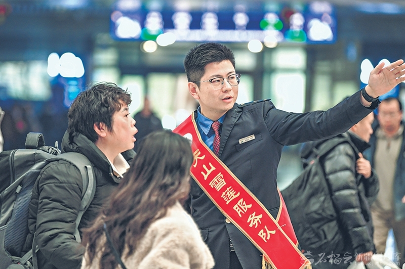 3月4日,中国铁路乌鲁木齐局集团有限公司乌鲁木齐站客运车间“天山雪莲”服务队队员在候车大厅引导客流。 □石榴云/新疆日报记者 汤永摄