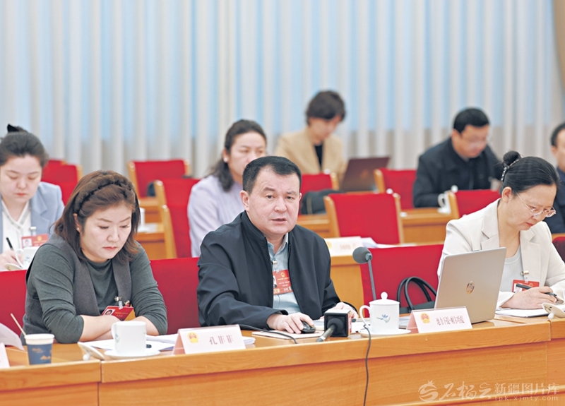3月10日,十四届全国人大四次会议新疆代表团举行小组会议。图为地力下提·帕尔哈提代表(中)在发言时就加快构建西部地区法院涉外审判人才培养等提出建议。□石榴云/新疆日报记者 崔志坚摄