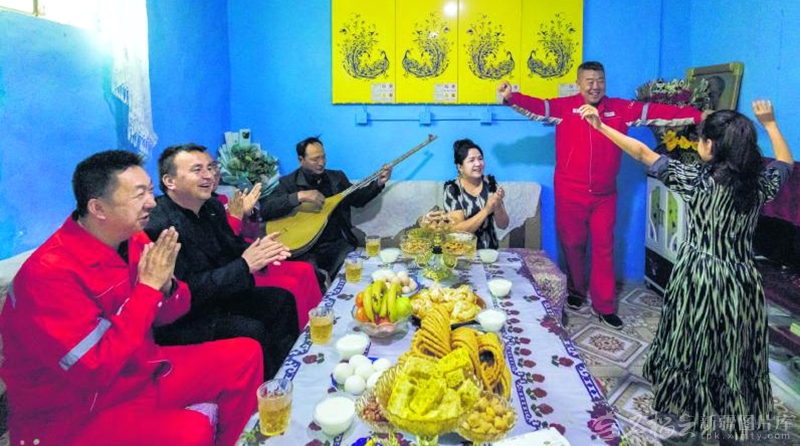 3月21日,中国石油新疆油田公司驻泽普县依克苏乡托万恰喀村工作队队员与村民欢聚一堂、共庆节日。 □张昀摄
