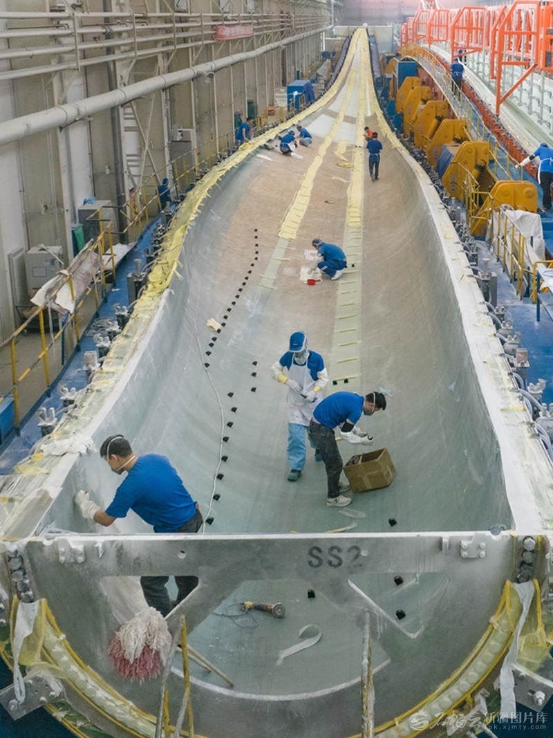 工作人员在位于昌吉国家高新技术产业开发区的新疆成飞新材料有限公司风电叶片生产基地,生产风力发电机组叶片。□何龙摄