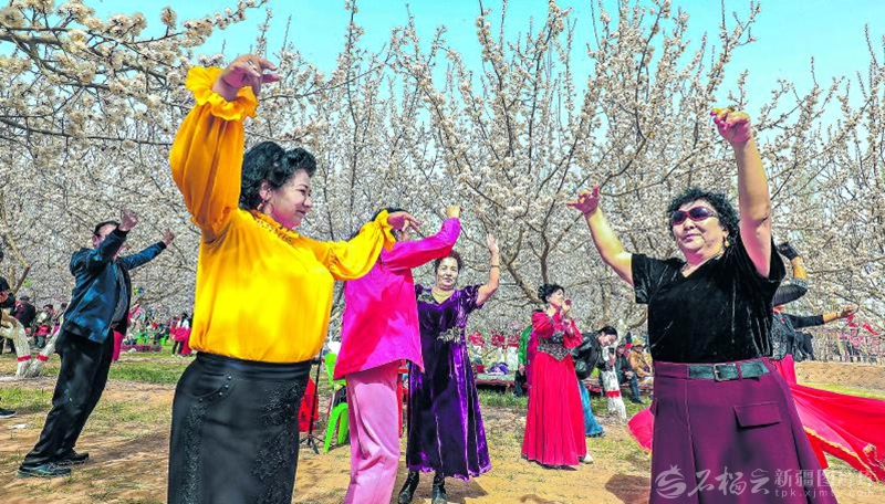 3月28日,在库车市牙哈镇托克乃村杏园,游客伴着春光翩然起舞。当日,库车市2026年春季“群众村晚”暨“杏花丝路 春满龟兹”系列文体活动在该村启幕,吸引众多游客打卡游玩。 □卜登鹏摄