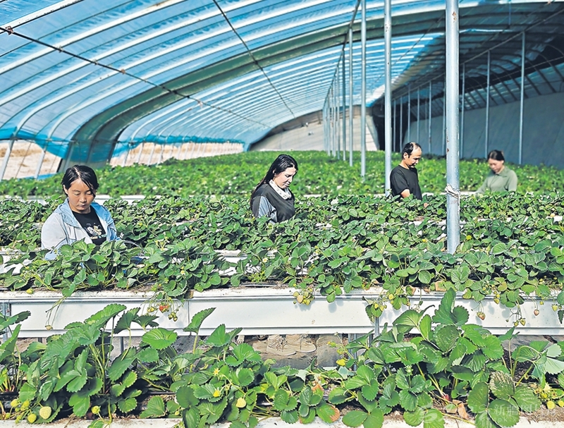 4月6日,在焉耆回族自治县北大渠乡高标准设施农业大棚里,兵团第二师22团职工和当地村民一起采摘准备上市的草莓。近年来,该团与周边县、乡镇携手发展设施农业,共同增收致富。 □谢江林摄