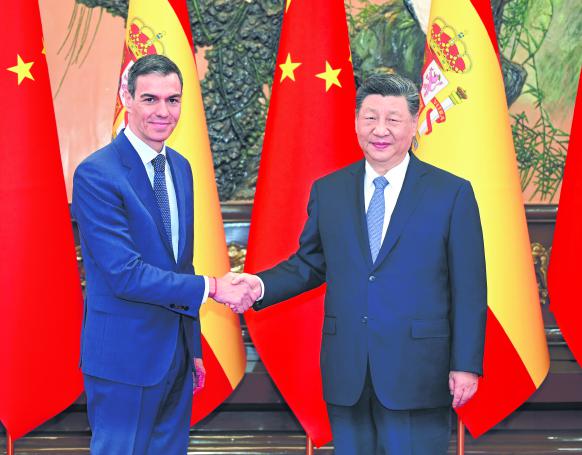 桑切斯表示,我4年来4次访华,表明双方对西中关系的高度重视。中国企业在西投资合作有力促进了西经济发展。西班牙坚定恪守一个中国原则,高度重视中国的大国地位,坚定致力于发展具有战略定力的西中伙伴关系,希望加强贸易、投资、新能源等领域合作,促进人文交流。面对复杂严峻的国际形势和频发多发的冲突争端,只有坚持多边主义、推动构建多极世界才能为人类带来持久和平。西班牙积极支持习近平主席提出的四大全球倡议,愿同中方密切沟通协作,共同应对国际地缘政治、贸易保护主义、气候变化等方面挑战,维护国际法和多边主义。西班牙反对“新冷战”,反对“脱钩断链”,支持欧洲和中国增进沟通理解、加强合作。欧中关系健康发展符合双方共同利益,也有利于世界和平稳定。